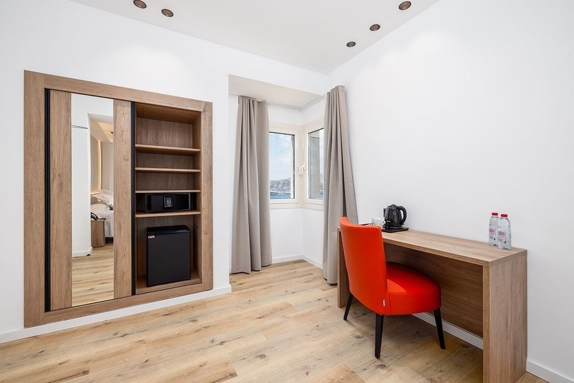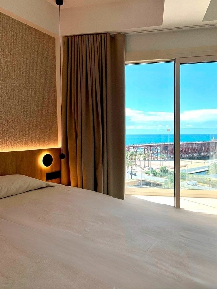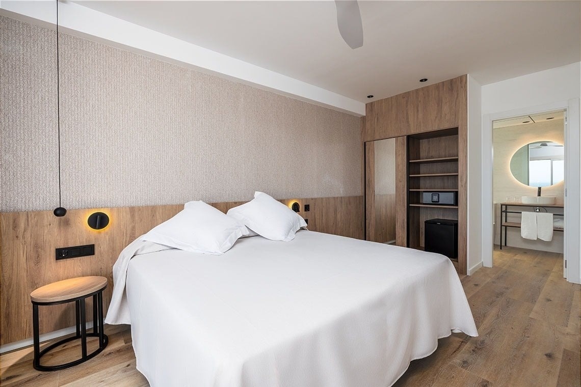 Descubra la tranquilidad y el confort de nuestras habitaciones con vistas al mar Mediterráneo, equipadas con una amplia cama de matrimonio de 180 cm o dos camas de 105 cm, baño completo con ducha y una agradable terraza para contemplar las vistas.